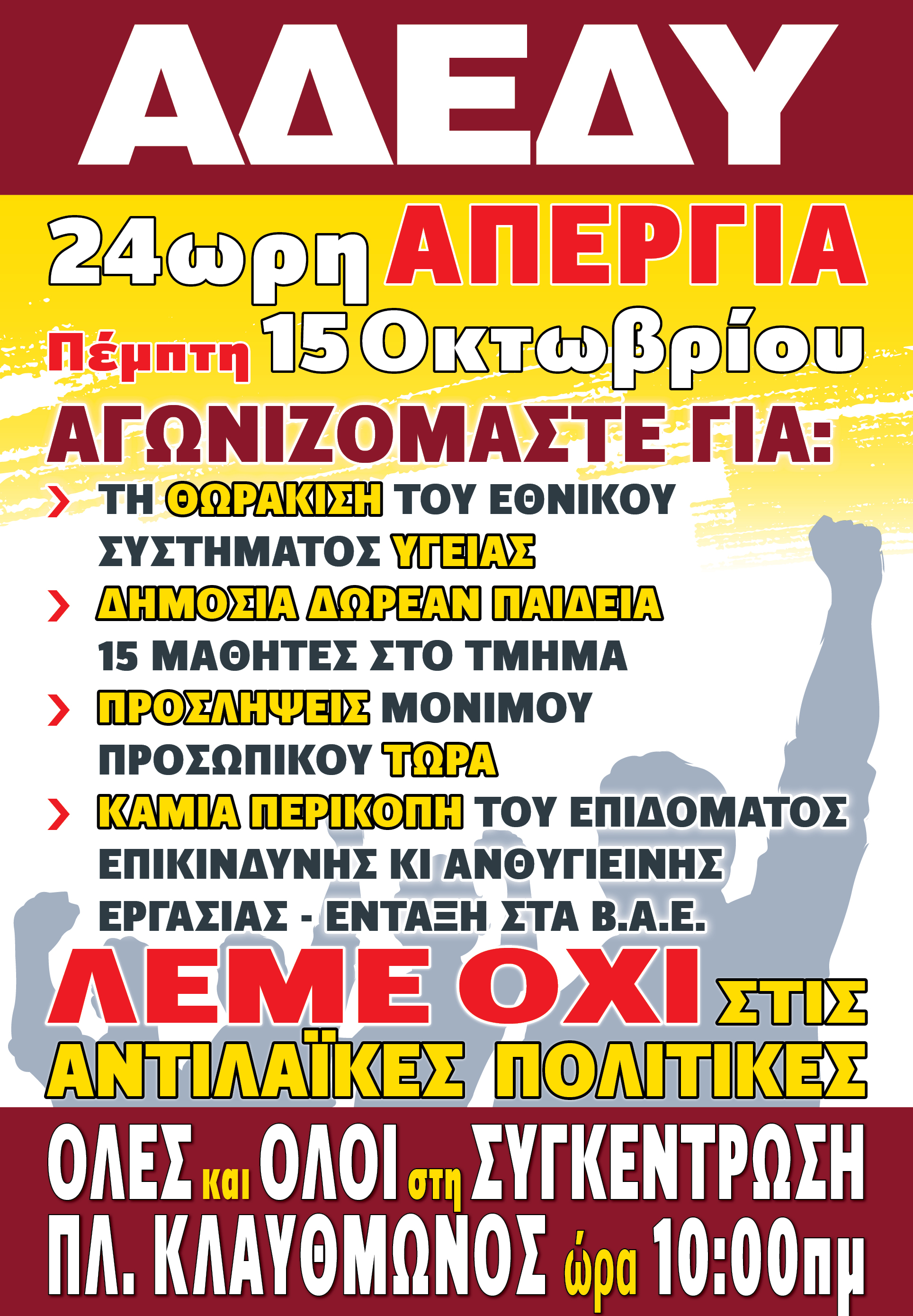 Η Ε.Ε. της ΑΔΕΔΥ αποφάσισε την κήρυξη 24ωρης απεργιακής κινητοποίησης την Πέμπτη 15/10/2020