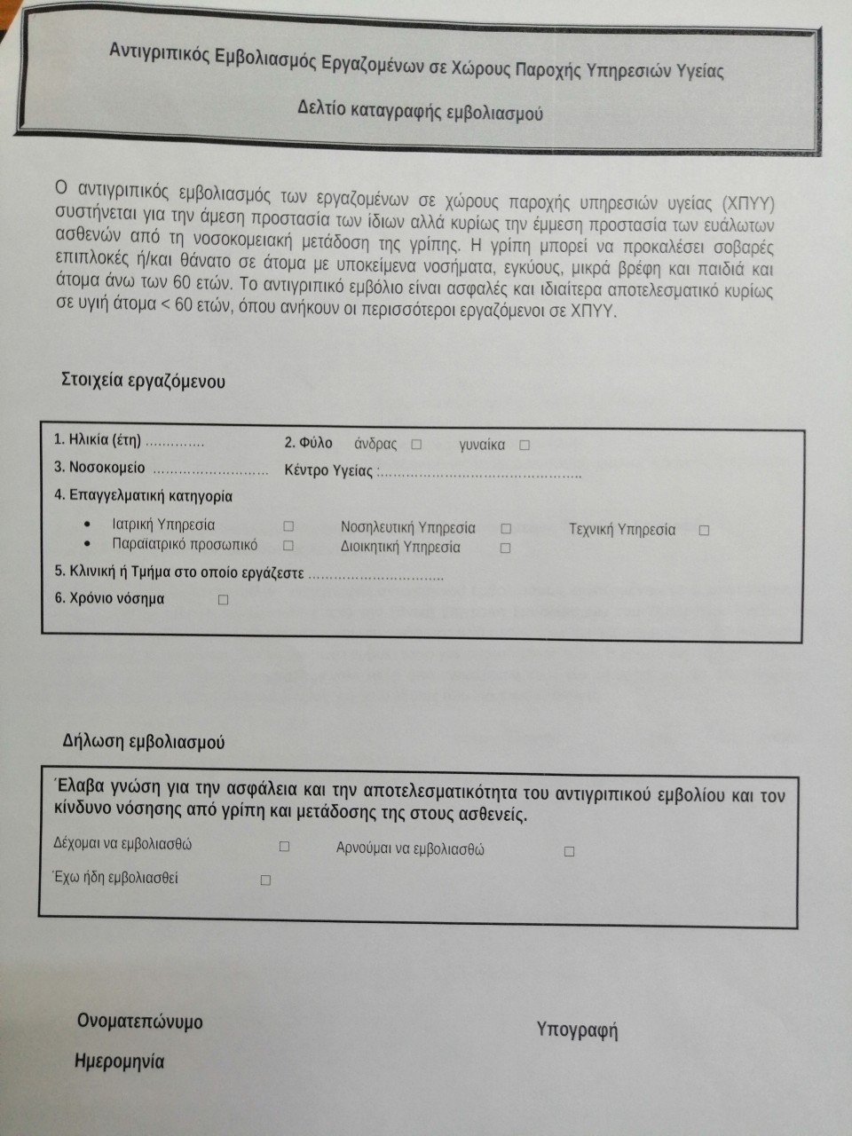Τα Νοσοκομεία ουδέποτε έδωσαν σημασία σε αυτή την φόρμα. Το ΚΕΕΛΠΝΟ έχει το ακριβές ποσοστό εμβολιαστικής κάλυψης των εργαζομένων στα Νοσοκομεία και τα Κέντρα Υγείας. Γιατί το κρύβει; Να δώσει στη δημοσιότητα το ποσοστό καθώς επίσης και τις αιτίες της χαμηλής εμβολιαστικής κάλυψης.