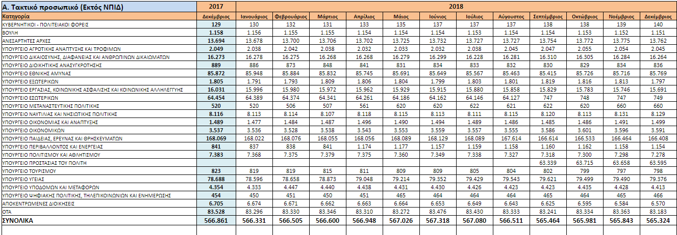 Από τα στοιχεία του ανθρώπινου δυναμικού, του Υπουργείου Δημόσιας Διοίκησης, προκύπτει ότι τον Δεκέμβριο του 2014 η Κυβέρνηση του Σύριζα παρέλαβε μόνιμο προσωπικό στο Υπουργείο Υγείας 79.535 και τον Δεκέμβριο 2018 το προσωπικό είναι 78.688. Από τον Ιανουάριο έως σήμερα συνταξιοδοτήθηκαν και άλλοι 1.000 υπάλληλοι (στοιχεία Γ.Λ.Κ.). Ως εκ τούτω το μόνιμο προσωπικό στο Υπουργείο Υγείας μειώθηκε κατά 1.845.