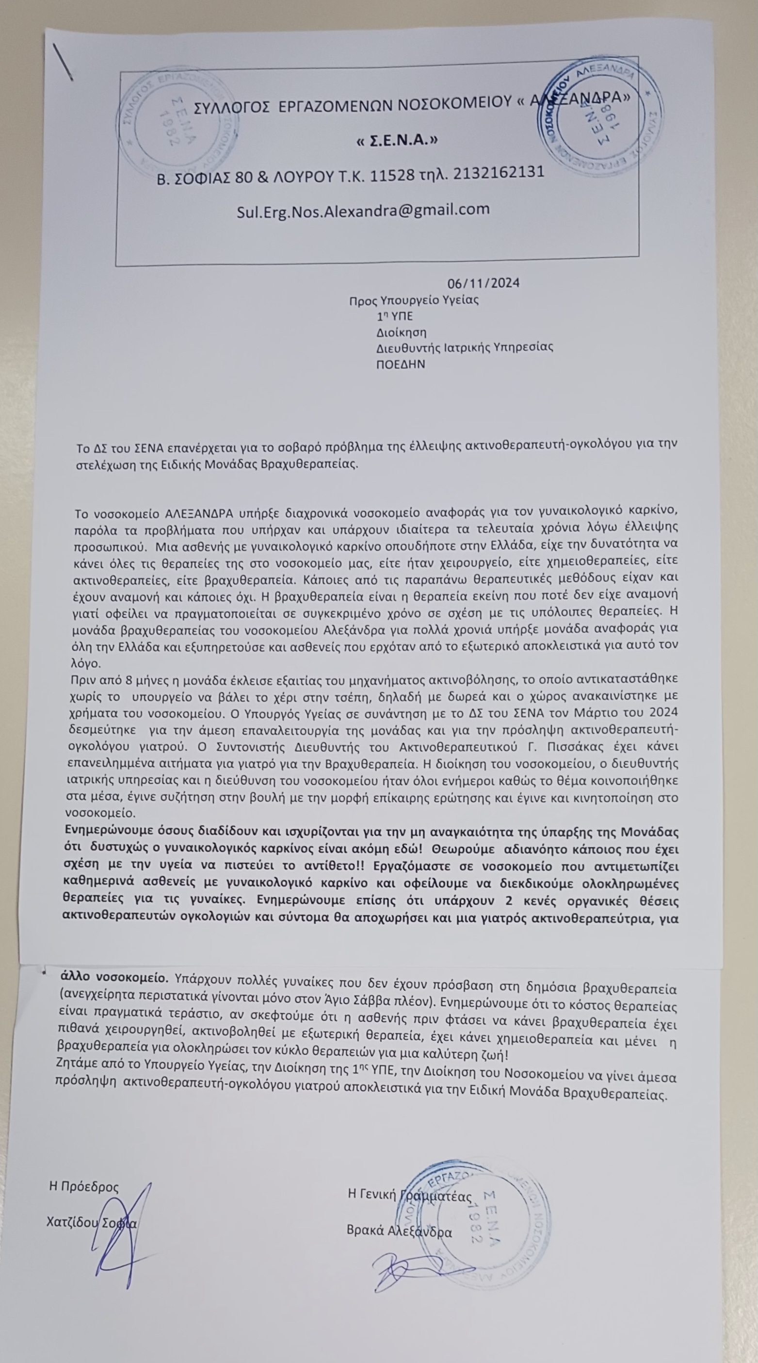 Κοινοποίηση εγγράφων στον Υπουργό Υγείας, του Σωματείου Εργαζομένων του Νοσοκομείου "Αλεξάνδρα" που επανέρχονται στα σοβαρά προβλήματα της έλλειψης ακτινοθεραπευτή- ογκολόγου για την ενίσχυση της μονάδας.