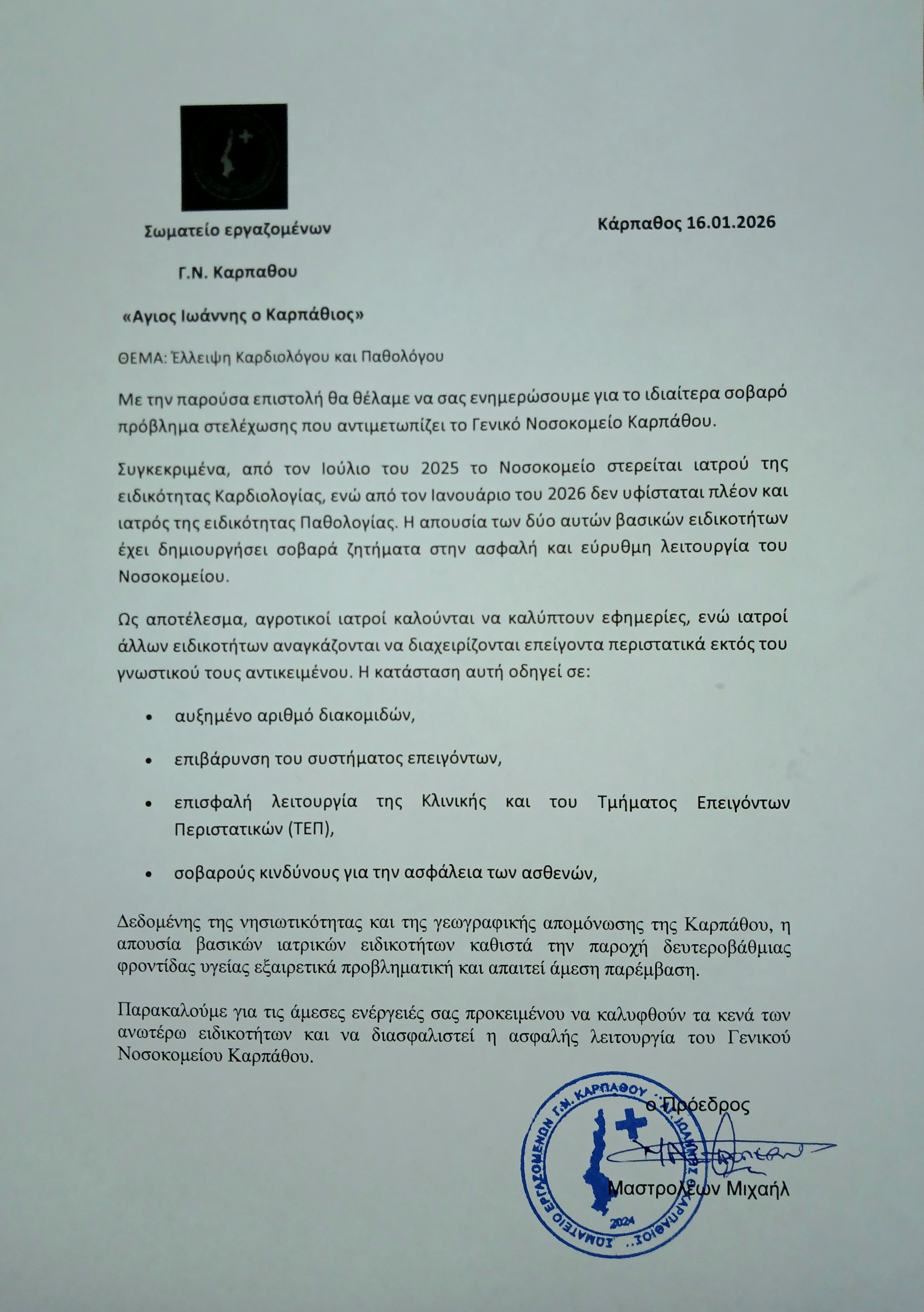 Κοινοποίηση εγγράφου στον Υπουργό Υγείας του Σωματείου Εργαζομένων του Γ.Ν. Καρπάθου, που αναφέρεται στην έλλειψη Καρδιολόγου και Παθολόγου, με αποτέλεσμα την αύξηση των αεροδιακομιδών και την επισφαλή λειτουργία του Νοσοκομείου.