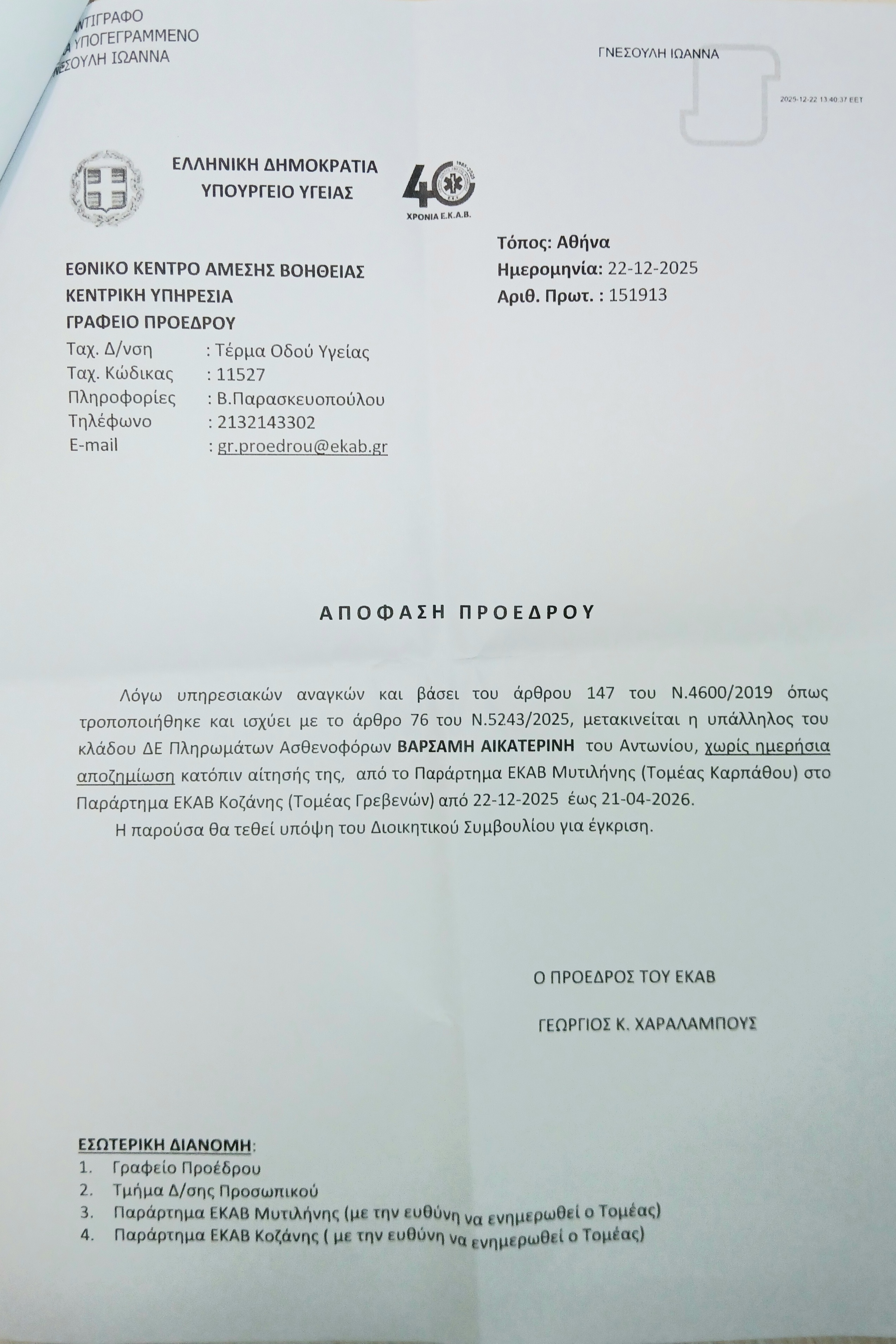 Εάν η νεοπροσληφθείσα συνάδελφος που μετακινήθηκε από τον τομέα του ΕΚΑΒ Καρπάθου εμπίπτει στις διατάξεις περί μετακινήσεων, θα πρέπει με νέες προσλήψεις να μεριμνήσετε για την στελέχωση του τομέα καθότι αδυνατούν οι εναπομείναντες διασώστες να καλύψουν τις βάρδιες με αποτέλεσμα να επέρχεται εργασιακή εξάντληση.