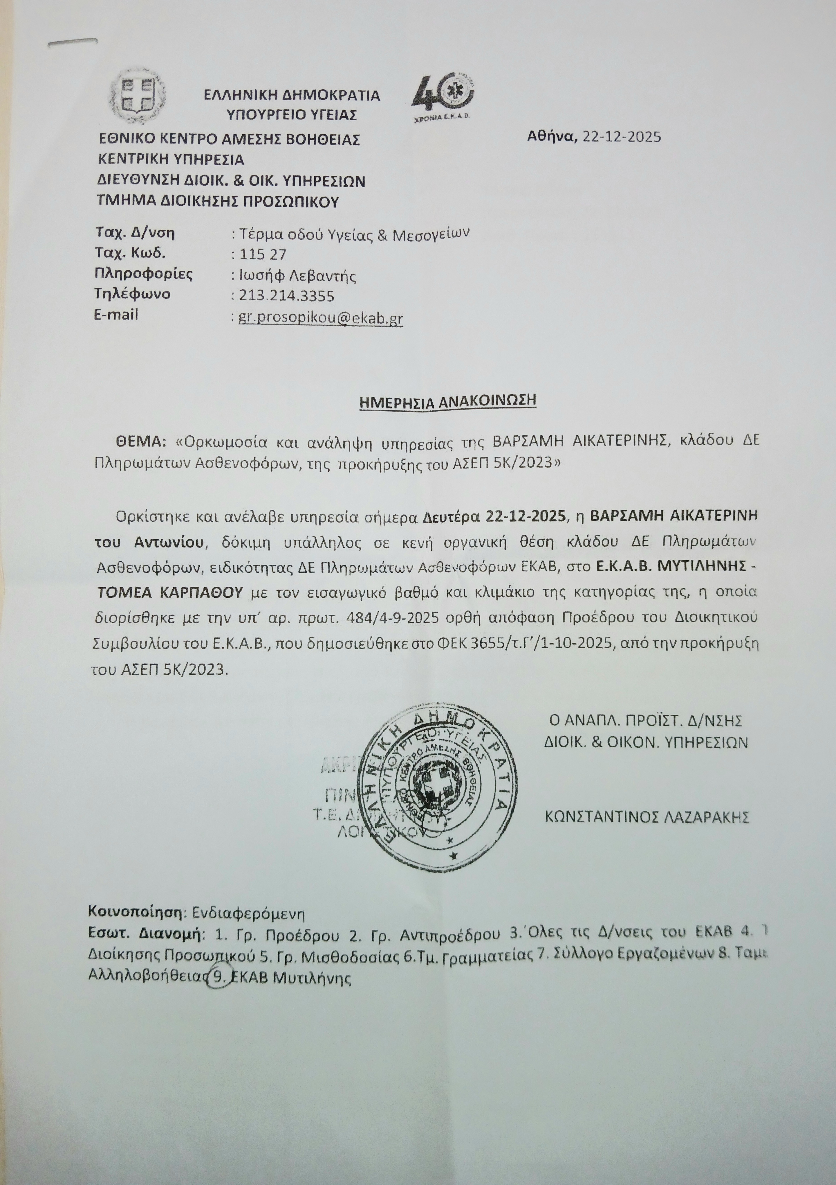 Κοινοποίηση καταγγελίας στον Υπουργό Υγείας του Σωματείου Εργαζομένων του Γ.Ν. Καρπάθου για την υποστελέχωση του τομέα ΕΚΑΒ Καρπάθου.